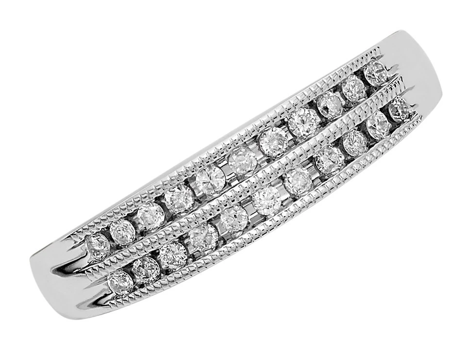 A pretty and very wearable white gold diamond band ring boasting a double row of bright white diamonds and attractive beaded edges that really catch the light. 5mm wide and 20pts (0.2ct) total diamond weight.