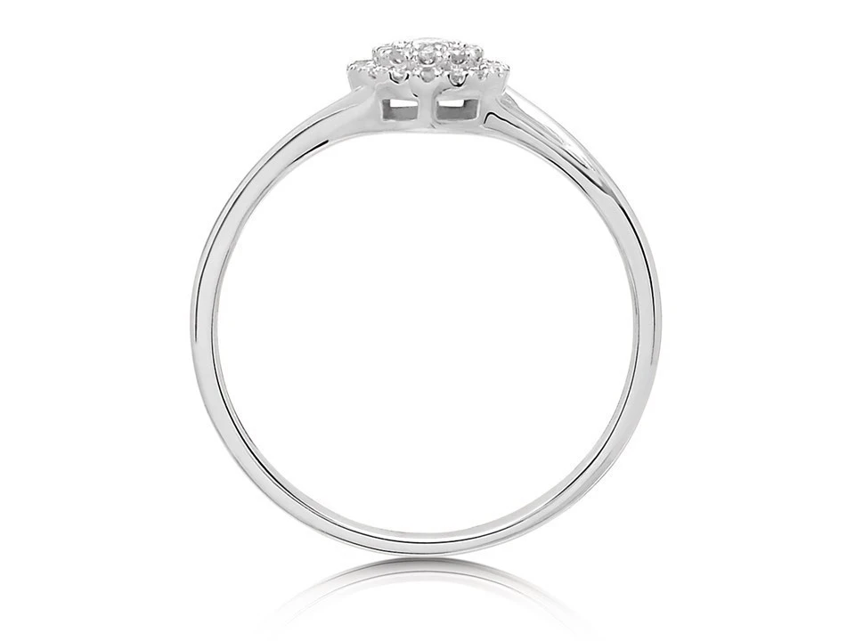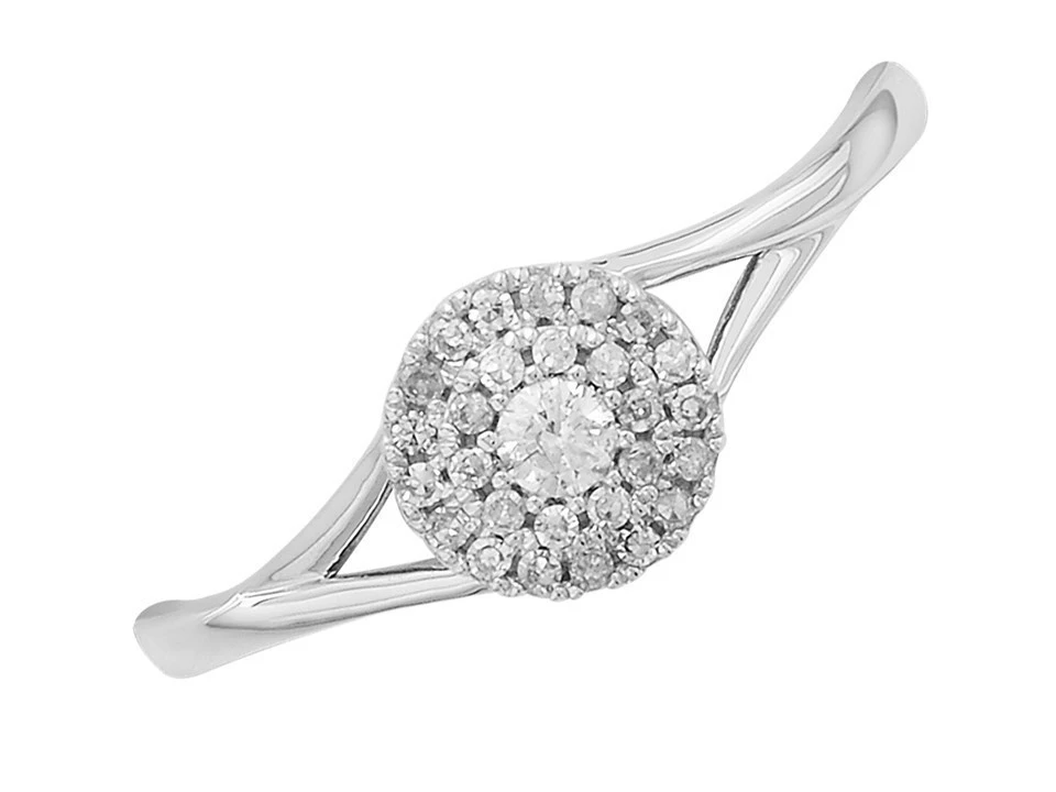 The 7mm cluster at the centre is created by three tiers; at the centre a larger diamond, encircled by two halos of even more diamonds, set on a split white gold band that tapers round the back. 15pts total diamond weight, this is a lovely white gold diamond cluster ring currently available at an exceptional price.