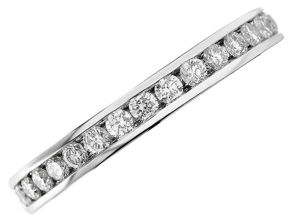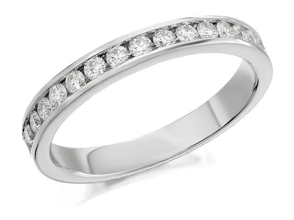 This 3mm wide, white gold band features twenty diamonds (1/2ct total diamond weight), each channel set around more than half the ring, with diamonds that has been independently certificated by the AGI (Antwerp Gemmological Institute) as a minimum of H/SI2. This is an unmissable opportunity to own a special ring that will be loved and worn for a lifetime. Selected sizes only.