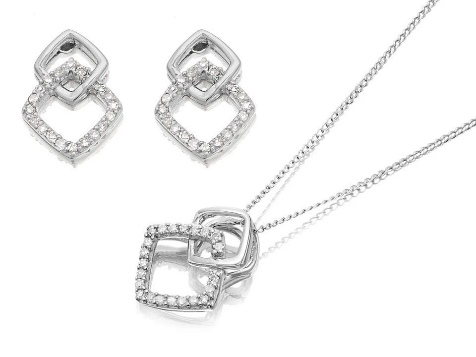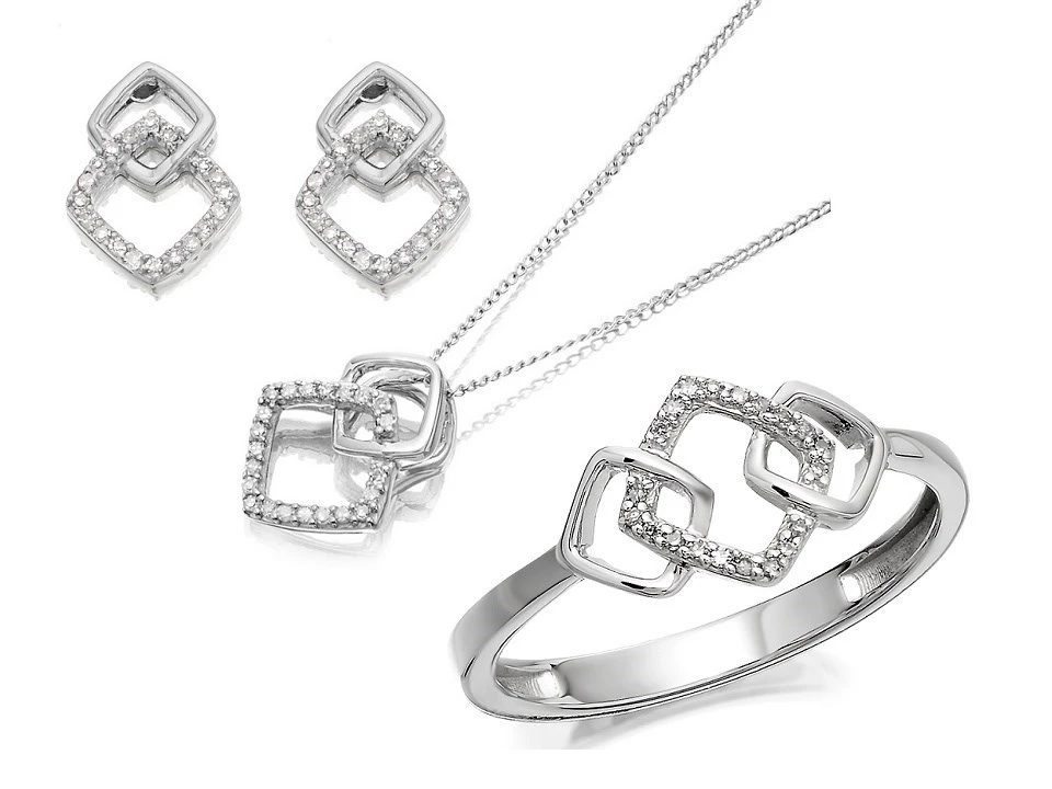 A lovely three piece gift set for someone special, comprising of a ring, stud earrings and necklace where each piece is perfect worn singly or in any combination. Diamonds are dotted over one of the interlocking, sideways set squares, the other squares polished 9ct white gold. 15pts total diamond weight for the set, necklace is strung on an 18″/45.5cm white gold chain and the earrings are secured with white gold butterfly scrolls. Available in selected sizes only.