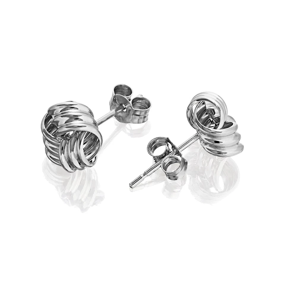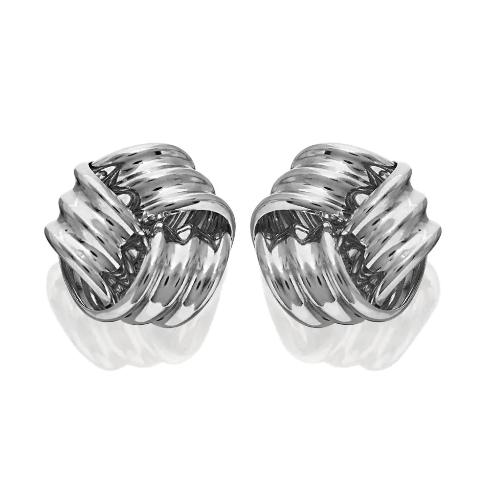 Classic 9ct white gold three stranded knot stud earrings with a grooved design. The perfect accessory for any occasion. Secured with white gold butterfly fittings, 8mm wide.