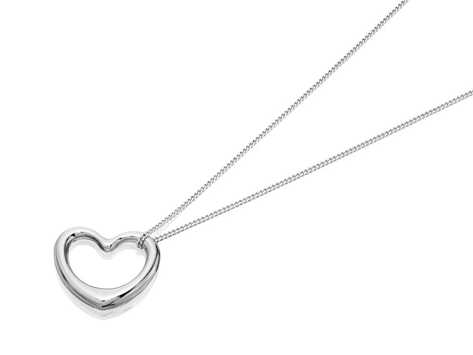 This 14mm open heart is strung from a fine 18″/46.5cm 9ct white gold chain, that’s freely-moving to sit assymetrically.