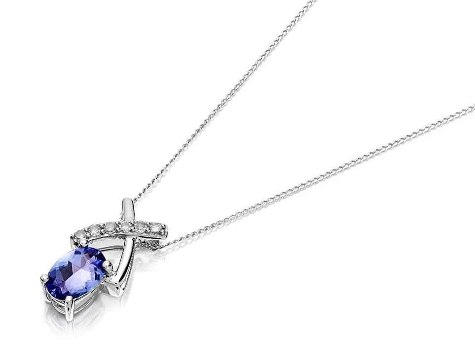 The 6 x 12mm pendant has a diamond accented kiss at the top and holds a stunning oval cut tanzanite in a four claw setting from its lower edge. Strung from an 18″/45.5cm white gold chain. From the F.Hinds guaranteed AA quality Kilimanjaro collection.