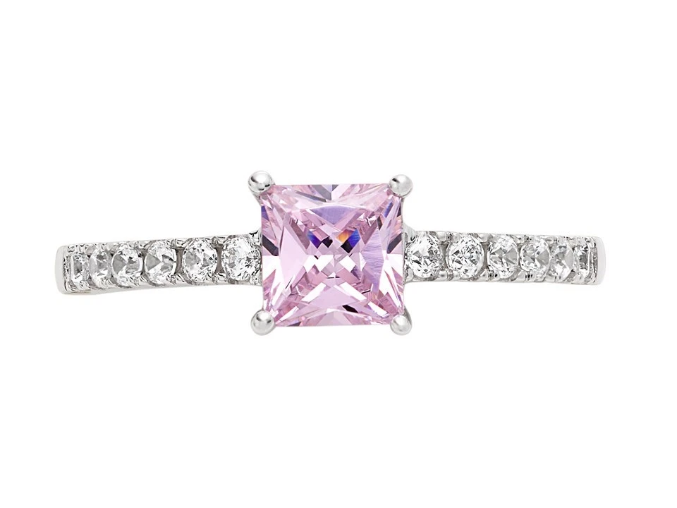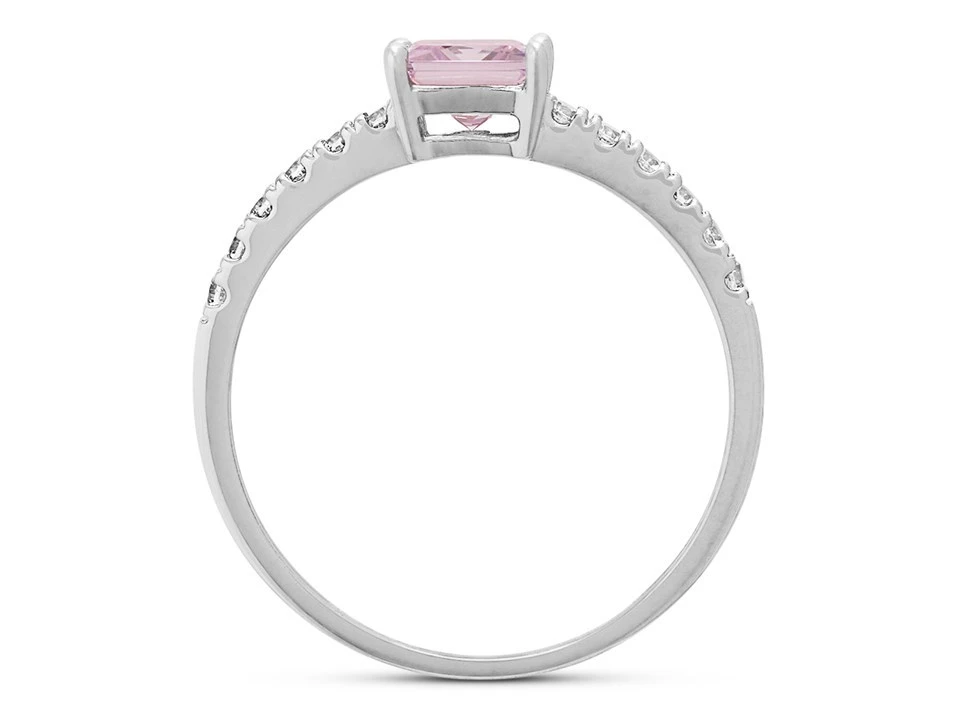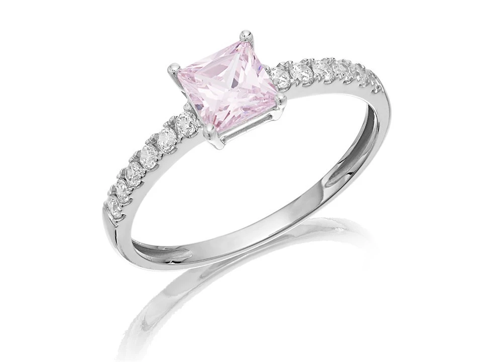 This lovely ring is made from precious 9ct white gold and includes a beautiful pink princess cut cubic zirconia, with further clear cubic zirconias along the shoulders.