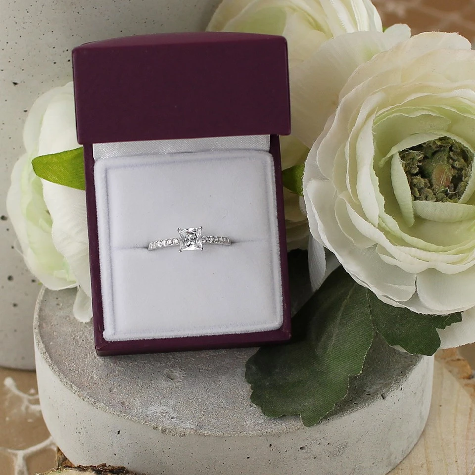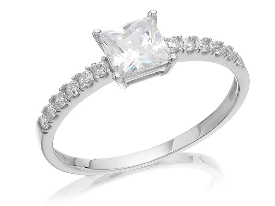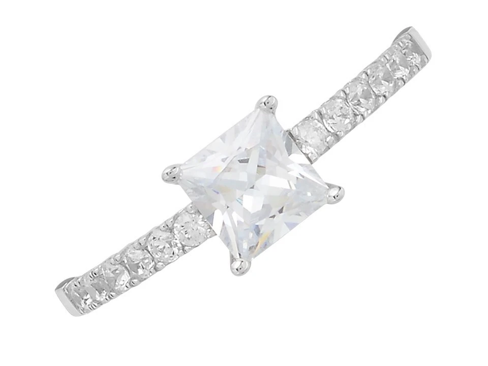 A square, claw set princess cut cubic zirconia is the star of the show, with six cubic zirconias on each shoulder. Available in selected sizes only, this white gold ring cannot be adjusted.