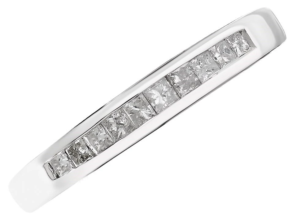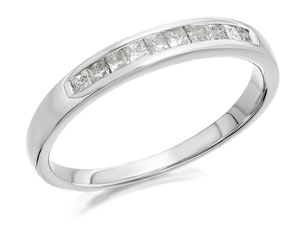 This stunning white gold half eternity ring boasts ten princess cut diamonds channel set along the front of the band. The tapered design makes the ring sit perfectly with other white gold rings, total diamond weight of 1/4ct (0.25ct/25pts). Available in selected sizes only.