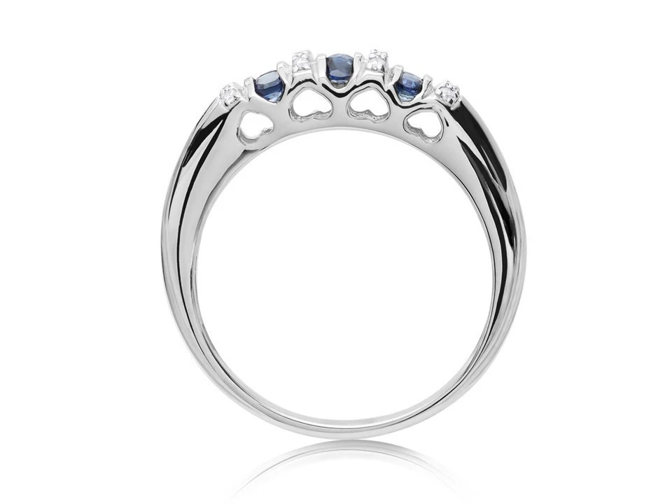 A very attractive white gold band ring boasting three rows of two round blue sapphires, alternating with four rows of sparkling diamonds (total diamond weight 6pts). Notice the unusual but pretty open hearts dotted at the side of the setting – perfect for letting light through the beautiful stones above. Exclusive to F.Hinds.