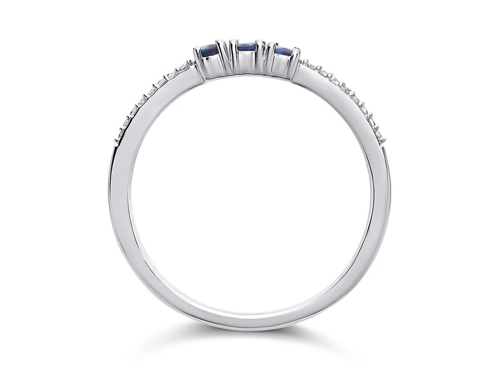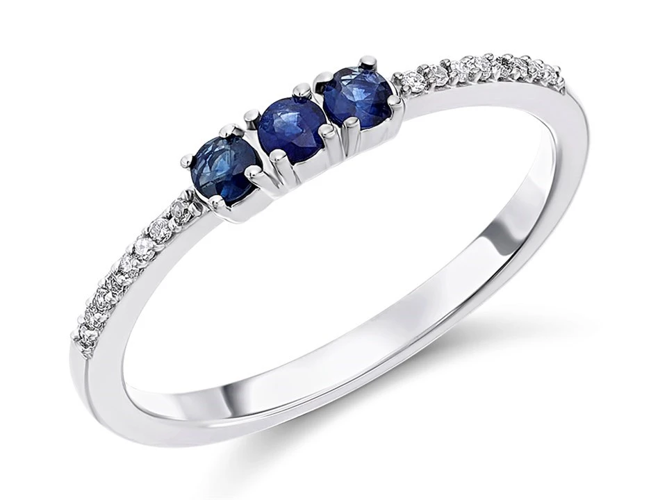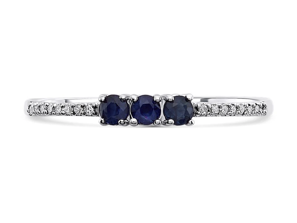 Featuring diamond set shoulders, this dainty 9ct white gold three stone ring has a trilogy of sapphires to add a touch of colour. 6pts total diamond weight.