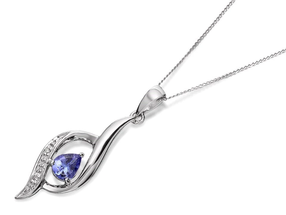 Two swirls of 9ct white gold, one set with diamond accents, between them a charming Kilimanjaro tanzanite, strung from an 18″/45.5cm fine chain. Pendant measures 22 x 10mm. From the F.Hinds guaranteed AA quality Kilimanjaro collection.