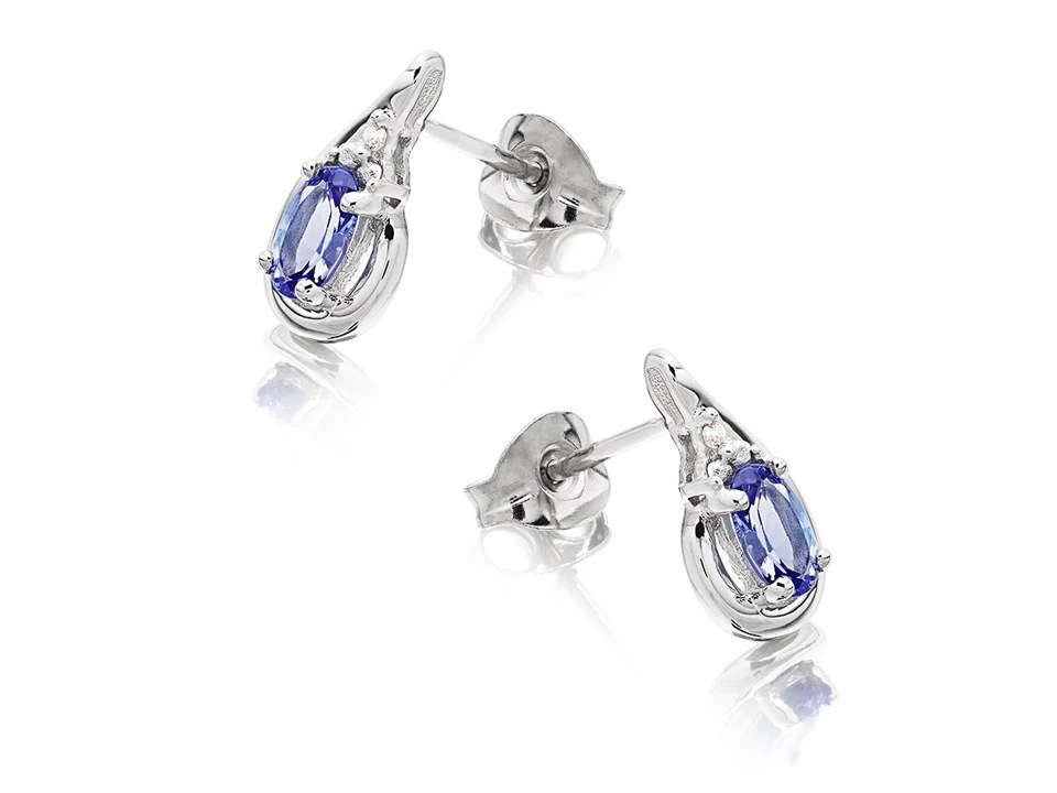 Swirls of 9ct white gold enfold the 3 x 5mm oval cut tanzanites with a diamond accent just above it. Studs measure 6 x 11mm, finished with white gold butterfly scrolls. From F.Hinds guaranteed AA quality Kilimanjaro collection.