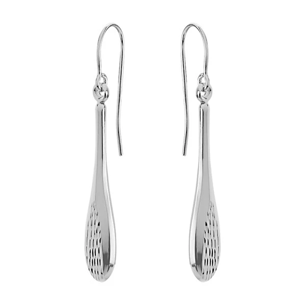 These contemporary 9ct white gold hook wire earrings feature an elongated teardrop design with textured panel to catch the light. Total drop 37mm.