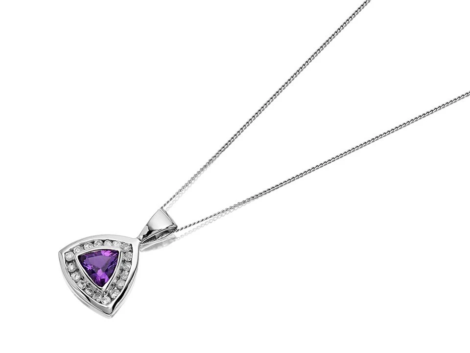 An 11mm wide triangle with a gorgeous trillion cut amethyst in the centre is surrounded by 18pts of diamonds, creating a necklace that would look very elegant when worn. Strung from an 18″/46.5cm white gold chain that’s fitted with a secure clasp.