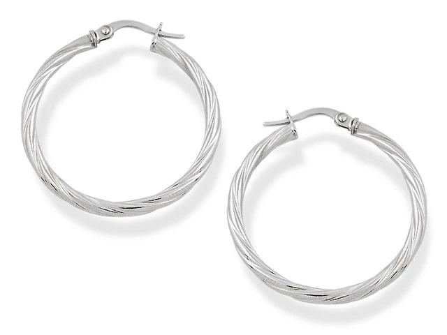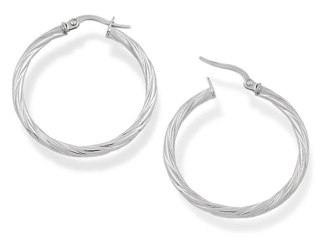 A twisted tube of 9ct white gold creates these interesting and very wearable 28mm hoop earrings, with easy to use snap-shut fittings.
