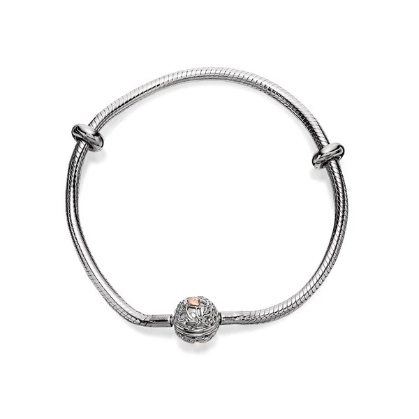A beautifully handcrafted sterling silver 19cm x 3mm snake chain bracelet with two moveable silver stoppers to organise and separate bead charms, plus a unique Clogau fastener that also looks like a bead with its Tree Of Life filigree design and 9ct rose gold heart, but is hinged to hold both ends of the chain. The beads of your choice can be added on every special occasion to eventually tell a story of personal milestones and landmark events in the most beautiful and unique way. Packaged and delivered with Clogau paperwork and gift box.