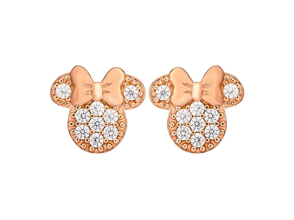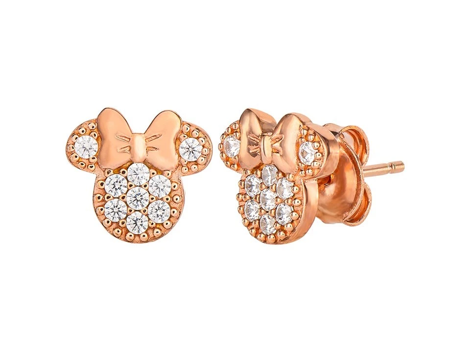 This wonderful pair of Disney Minnie Mouse sterling silver stud earrings would make the perfect gift for any Disney fan. Measuring 9 x 10mm and made of sterling silver with rose gold plate, crystals decorate the front face with a small bow on each earring. Supplied in a classic Disney gift box.