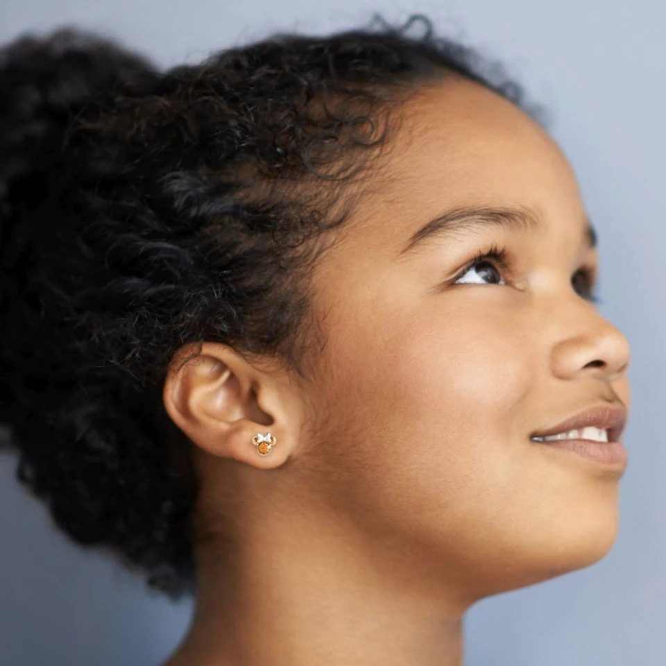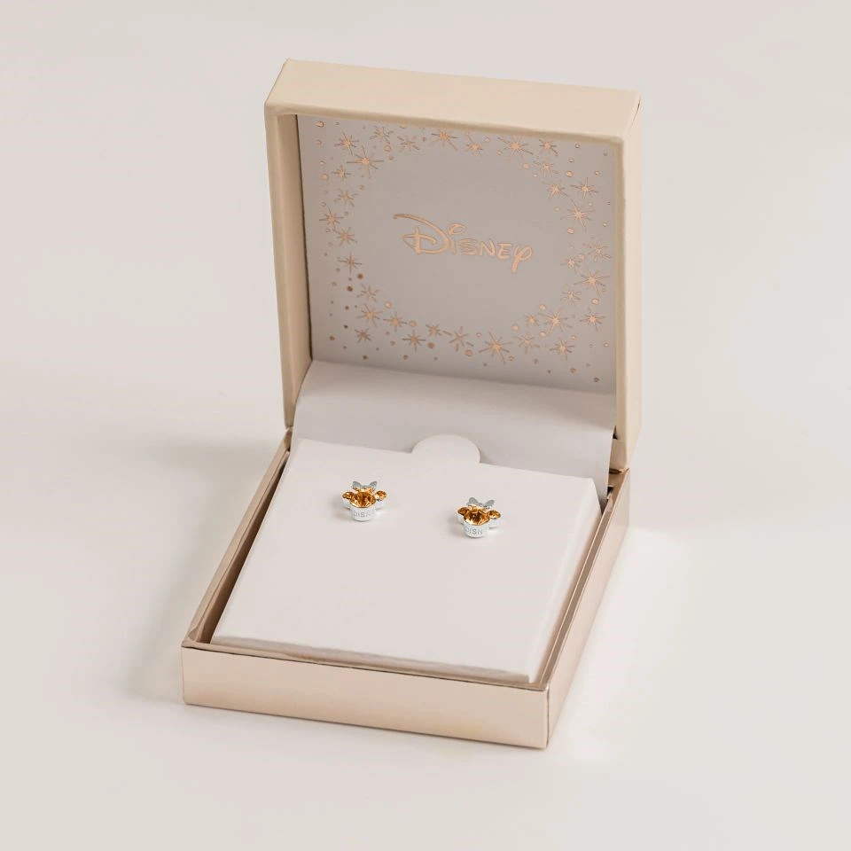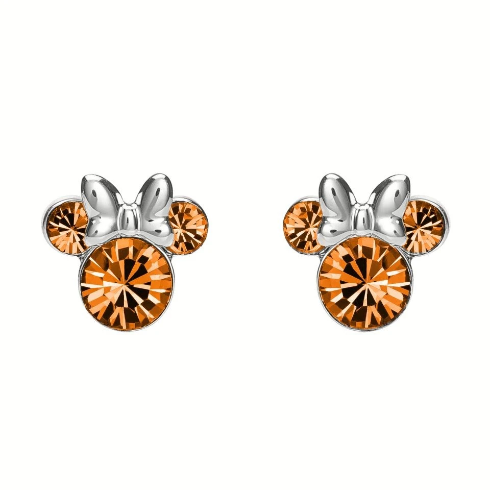 Very sweet 7mm Minnie Mouse stud earrings with orange crystals, perfect to give for a November birthday gift. Finished with sterling silver bows and butterfly backs and presented in official Disney packaging.