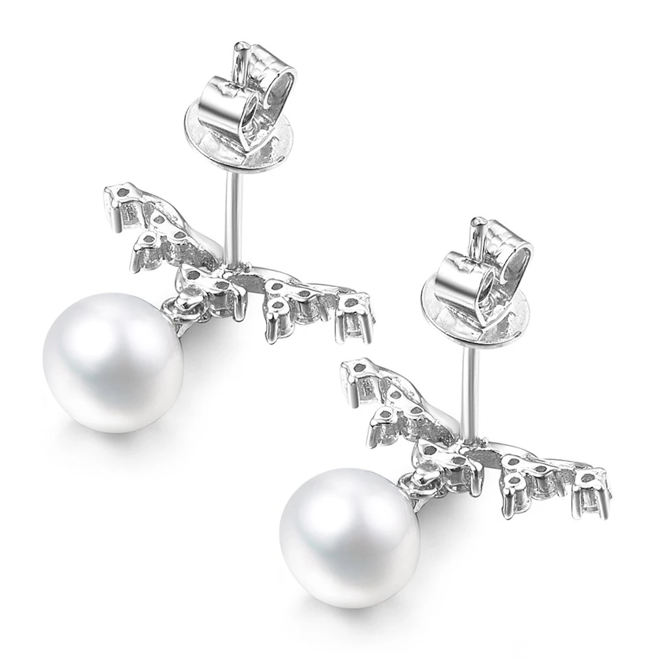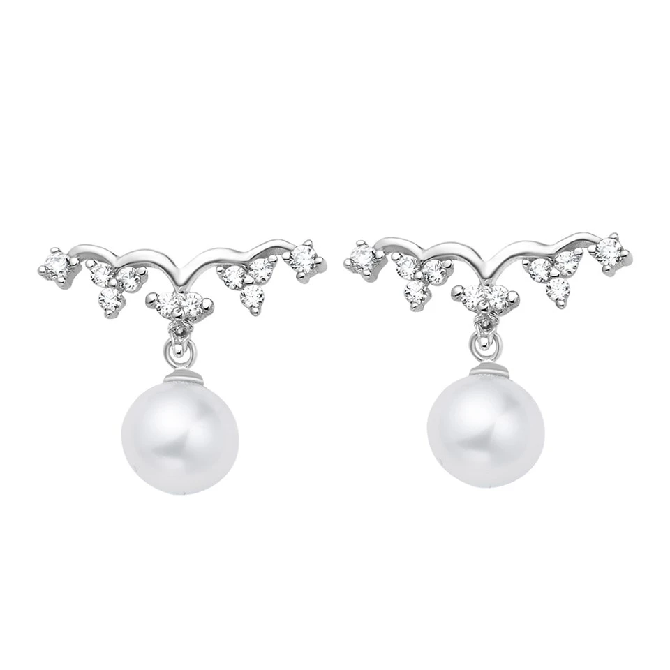 Unusual crown stud earrings with cubic zirconias and free-hanging freshwater pearls set in white rhodium plate on sterling silver. Measure 12 x 16mm, finished with silver butterfly backs.