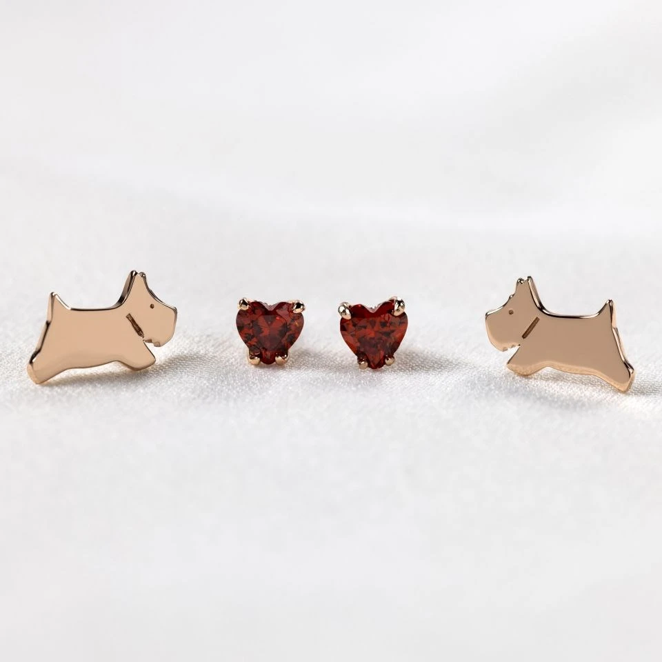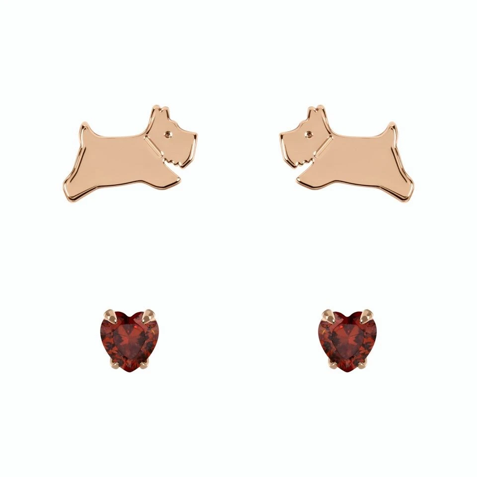 The perfect gift for a January birthday; this Radley stud earring gift set features a pair of 5mm heart cut, garnet coloured cubic zirconia studs (January’s birthstone colour) and a matching pair of 11 x 6mm jumping Radley dog studs. All are sterling silver throughout with an 18ct rose gold plating, finished with secure butterfly backs.