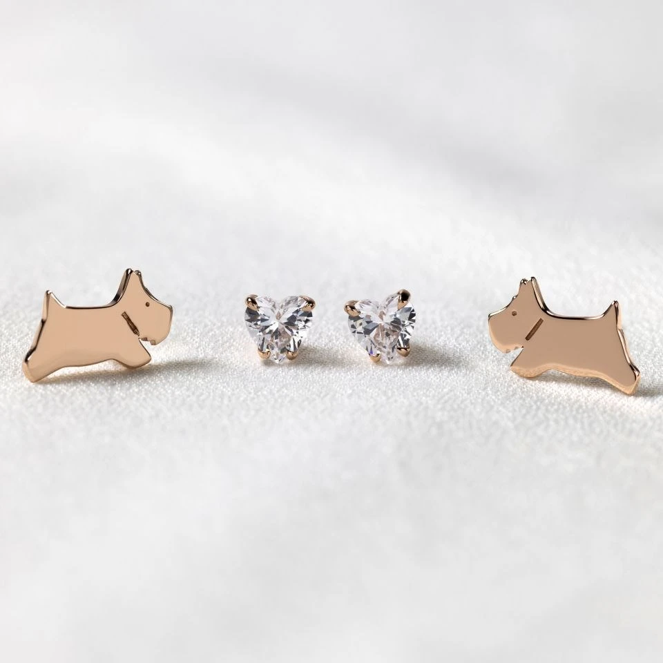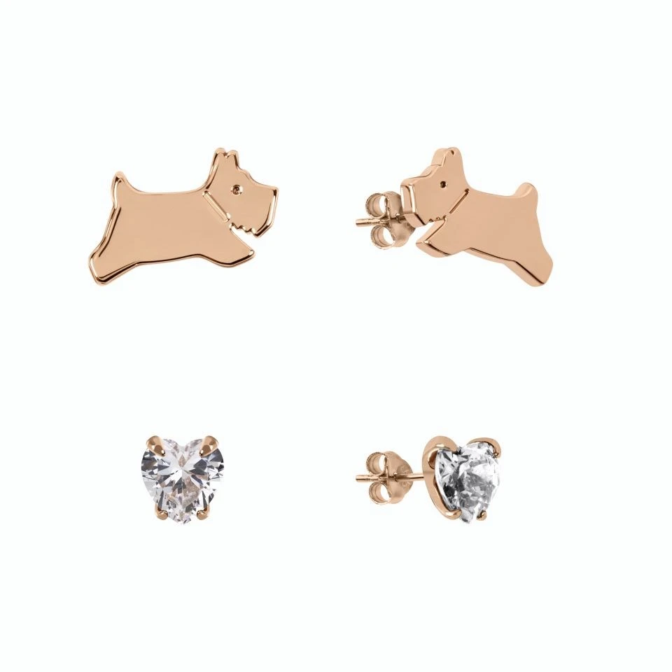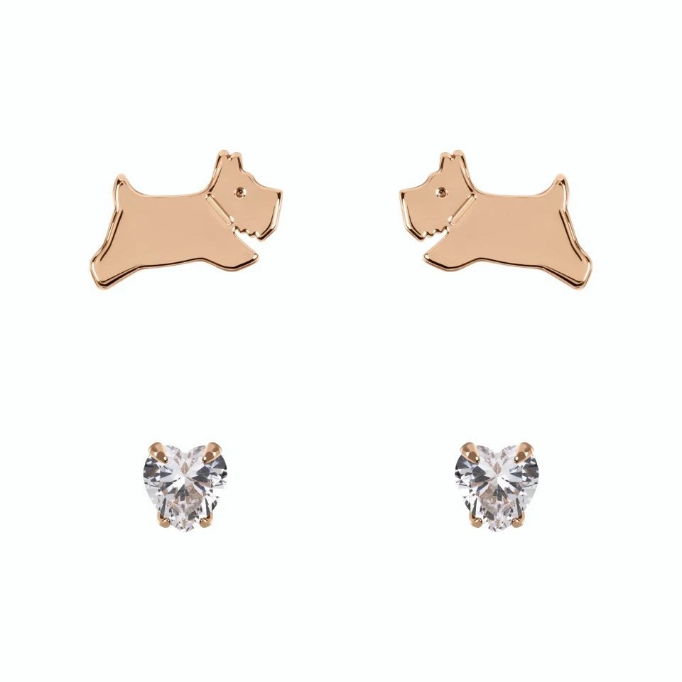 The perfect gift for a April birthday; this Radley stud earring gift set features a pair of 5mm heart cut cubic zirconia studs (April’s birthstone colour) and a matching pair of 11 x 6mm jumping Radley dog studs. All are sterling silver throughout with an 18ct rose gold plating, finished with secure butterfly backs.