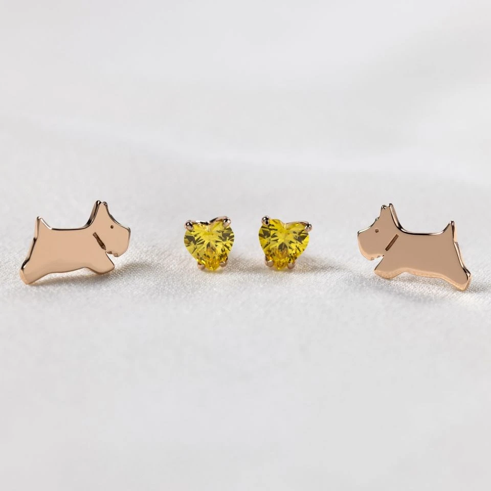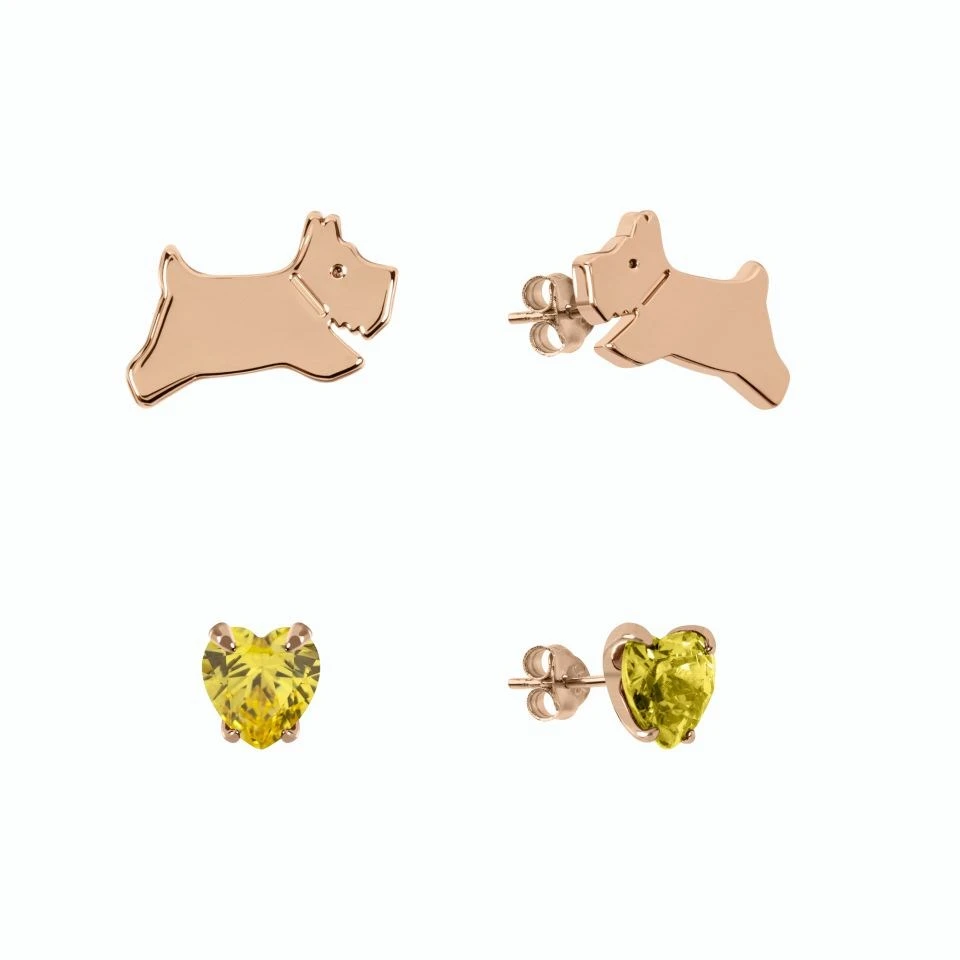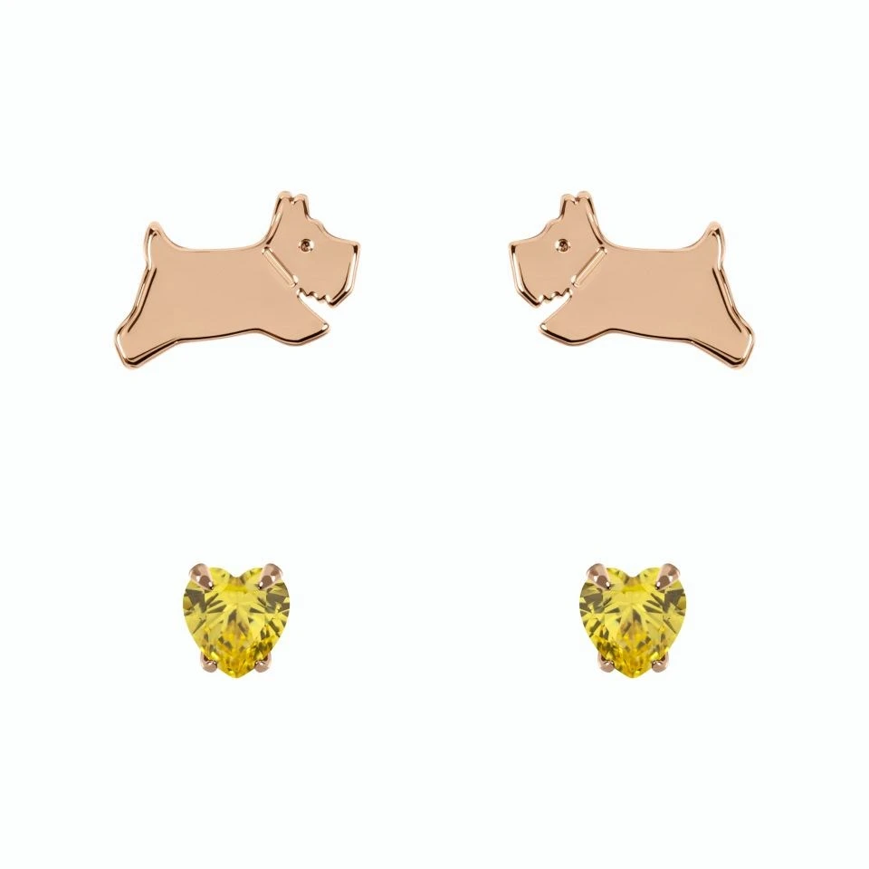 The perfect gift for a November birthday; this Radley stud earring gift set features a pair of 5mm heart cut yellow cubic zirconia studs (November’s birthstone colour) and a matching pair of 11 x 6mm jumping Radley dog studs. All are sterling silver throughout with an 18ct rose gold plating, finished with secure butterfly backs.