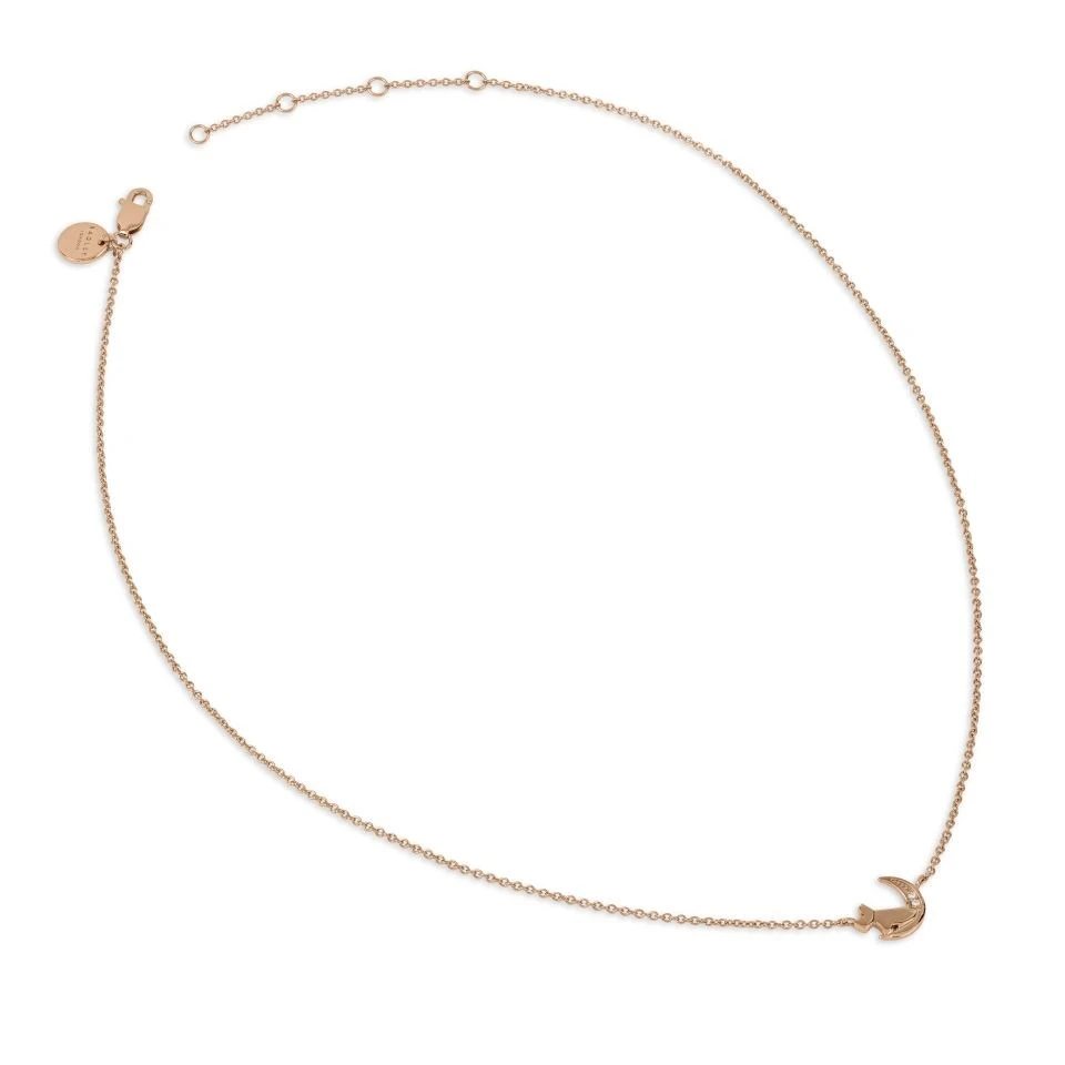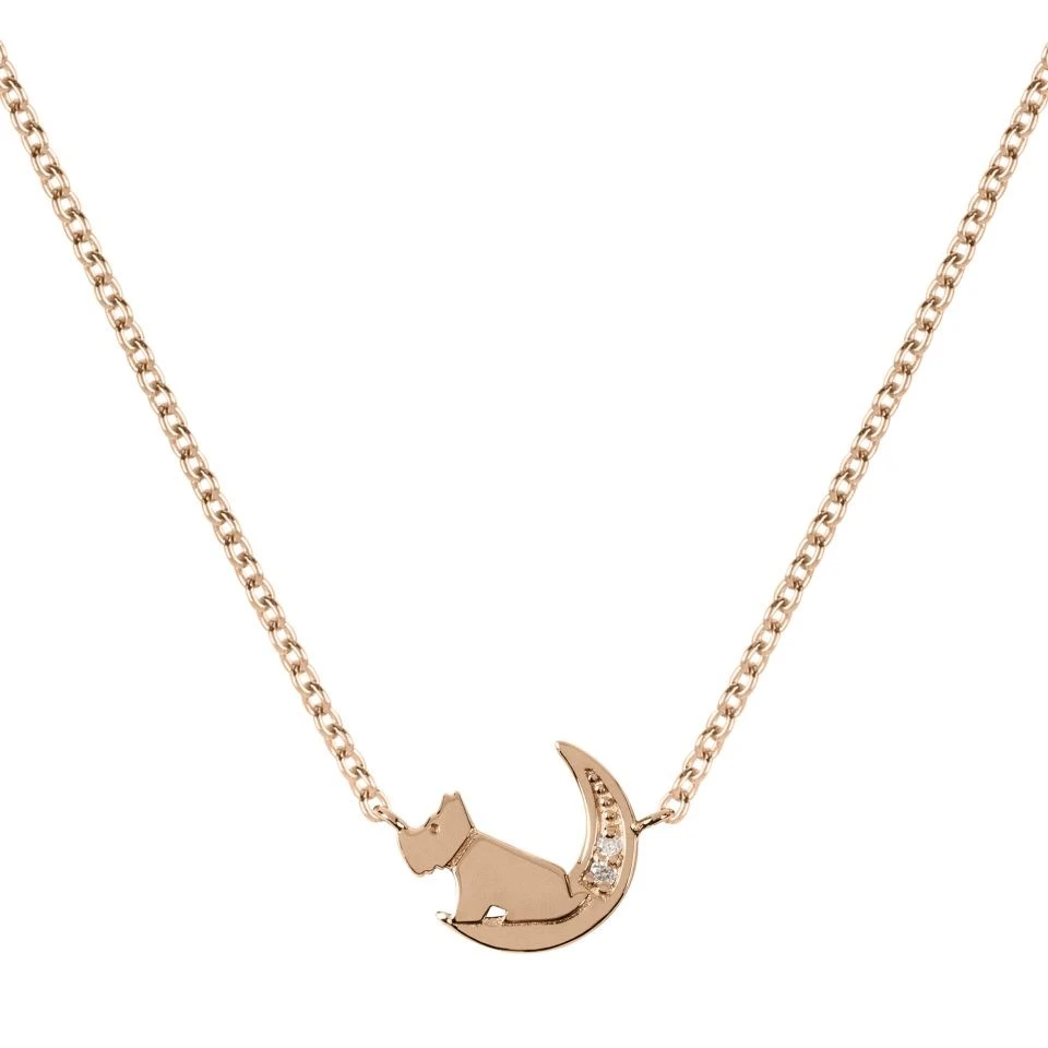 A very pretty Radley necklace made from sterling silver with 18ct rose gold plating. The iconic Radley dog sits comfortably on a fixed moon, which boasts a sparkling diamond for added luxury. Pendant measures 11mm wide and is strung from an adjustable to 18″/46cm rose gold plated silver chain.