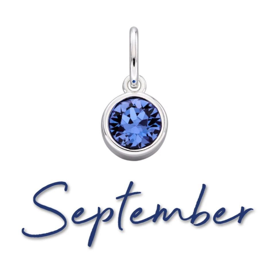 Personalise your pendant with this birthstone charm to make your gift extra special. The birthstone for September is sapphire and is represented here with a blue cubic zirconia in a 7mm wide, sterling silver mount.