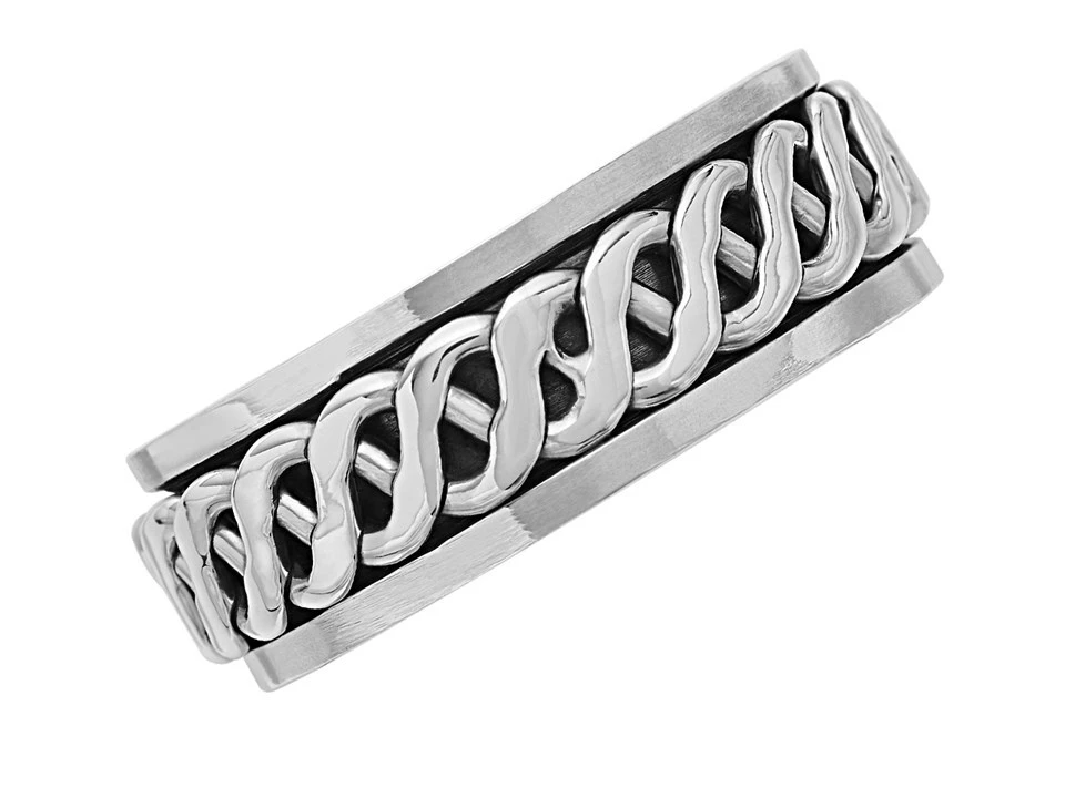 An interesting and stylish sterling silver band ring, traditionally called a worry ring. The central, celtic style lattice band revolves, 8mm wide.
