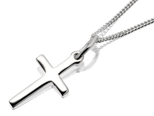 One of our most dainty sterling silver crosses 10 x 20mm, with a polished finish, strung from a 16in/41cm chain.