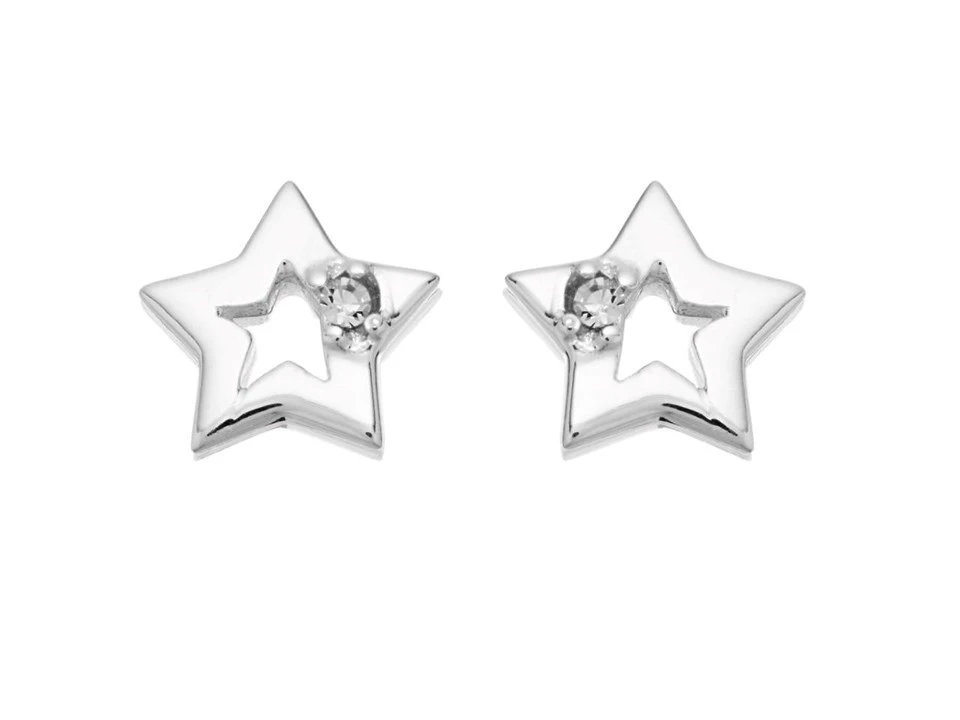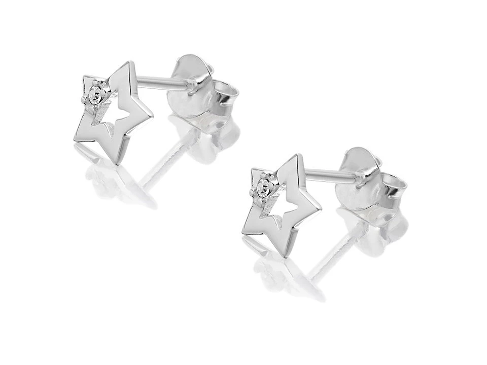 Dainty 7mm, five point stars with an open centre to look good on the ear, plus a cubic zirconia for sparkle on one corner.