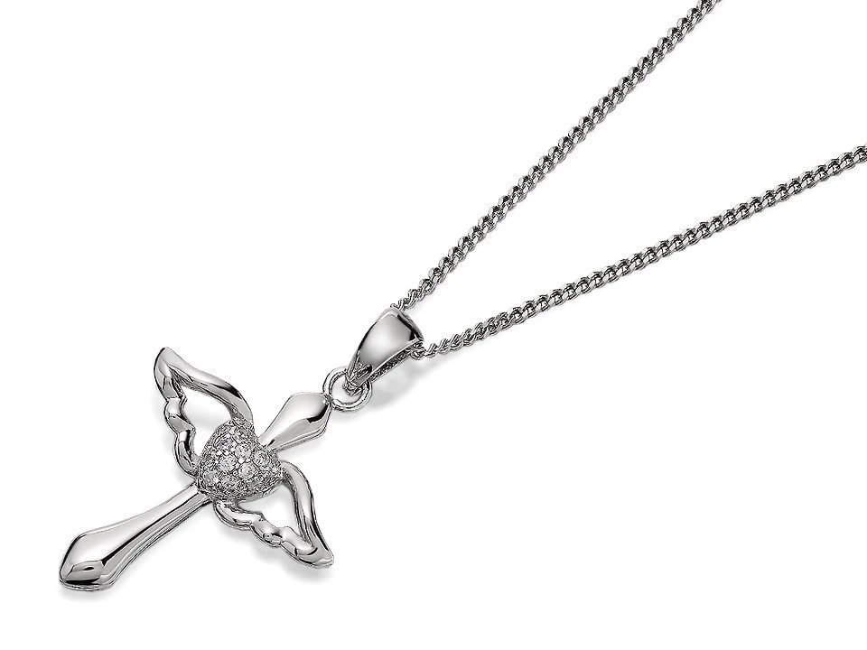 With a mix between an angel necklace and a winged angel cross, this lovely sterling silver piece of jewellery could act as both – for that special angel in your life perhaps? Measuring 19mm long x 15mm wide, the angel cross boasts delicate open wings and a heart shaped body studded with sparkling cubic zirconias. Strung from an 18″/45.5cm silver chain.