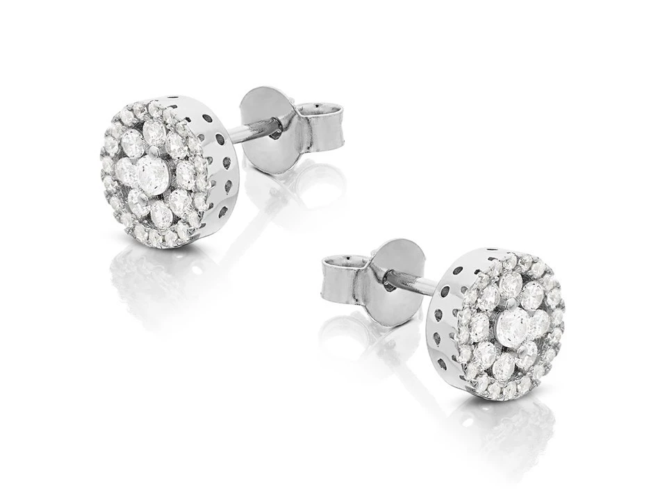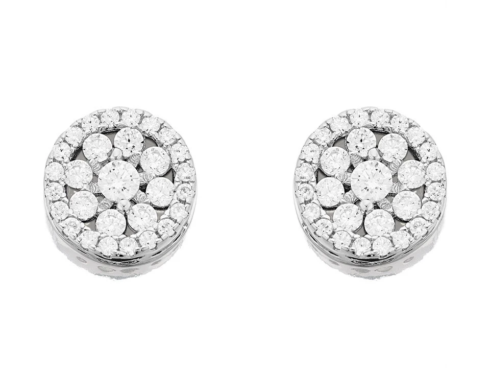 These eye catching sterling silver stud earrings feature a cluster of sparkling stones set in a halo design. Measuring 8mm, they are secured with a butterfly fitting.