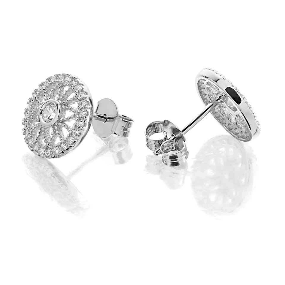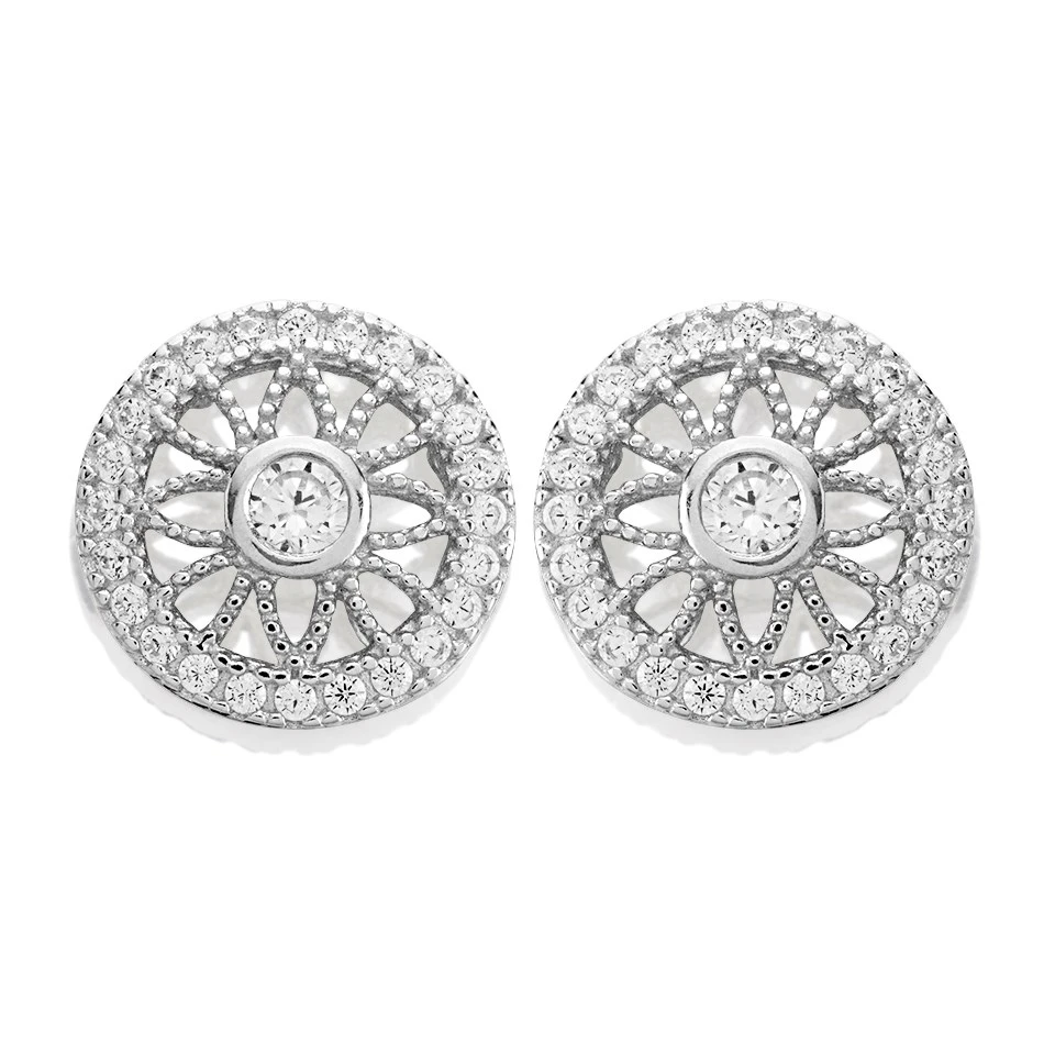 With a central set cubic zirconia stone, these pretty 10mm wide sterling silver stud earrings also feature an open flower design surrounded with a halo of sparkle. Secured with silver butterfly fittings.
