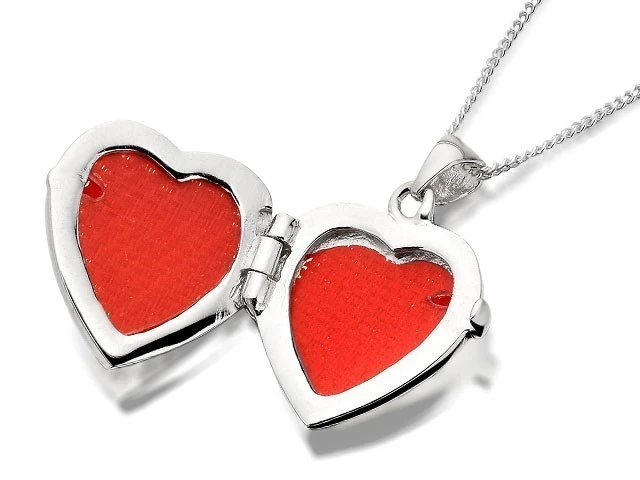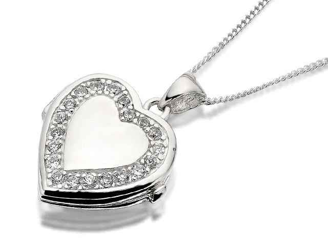 A classic sterling silver 16mm x 16mm heart locket opens to reveal two miniature picture frames, with a heart shaped row of cubic zirconias on the front, strung on a 18in/45.5cm fine flat link curb chain.