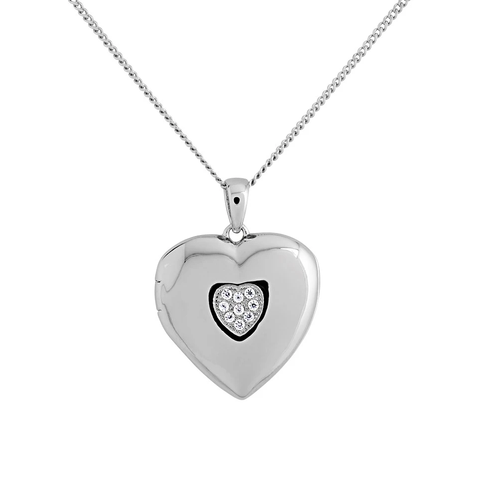 A rounded heart locket perfect for storing a couple of photographs or special mementos. Measuring 17mm, the locket boasts a 5mm cubic zirconia studded heart at the centre and is strung from an 18″/45.5cm silver chain.