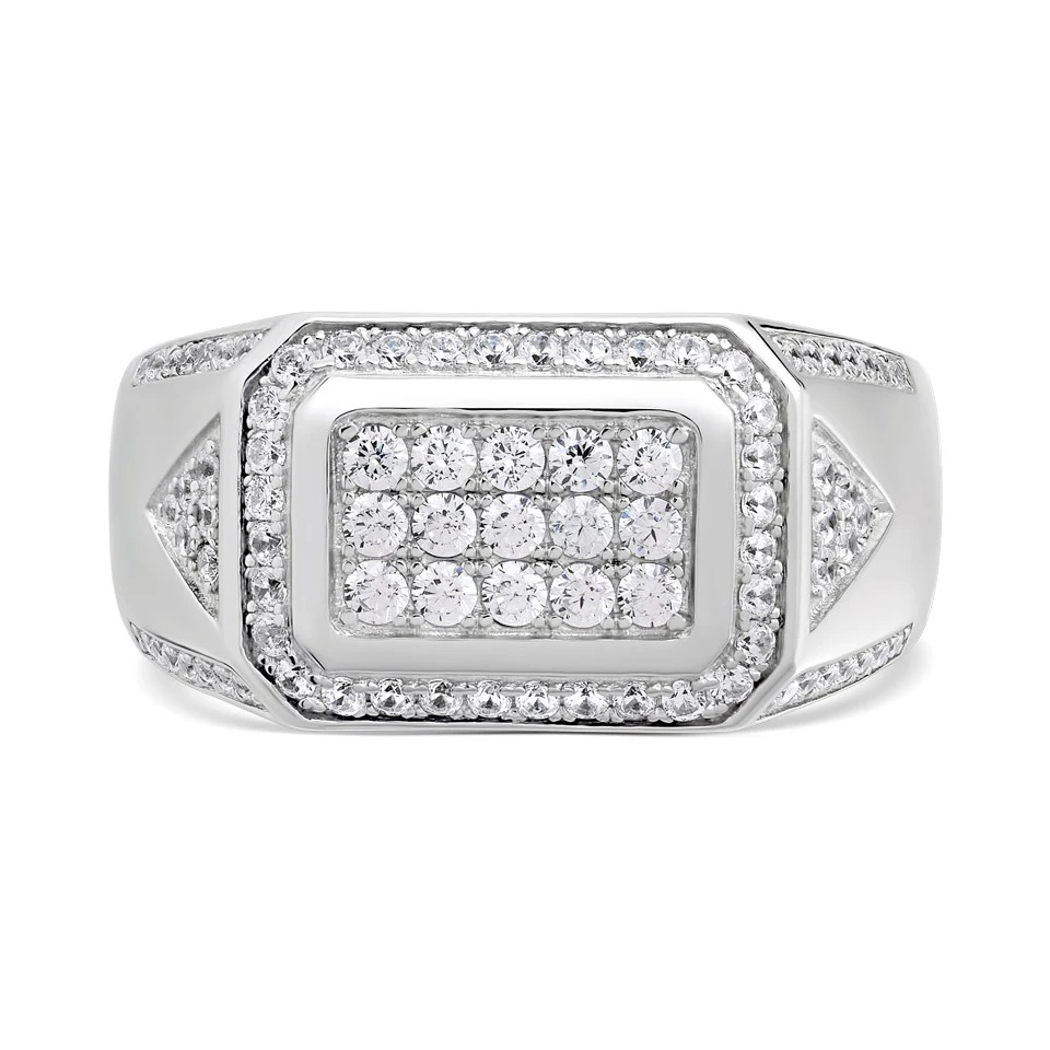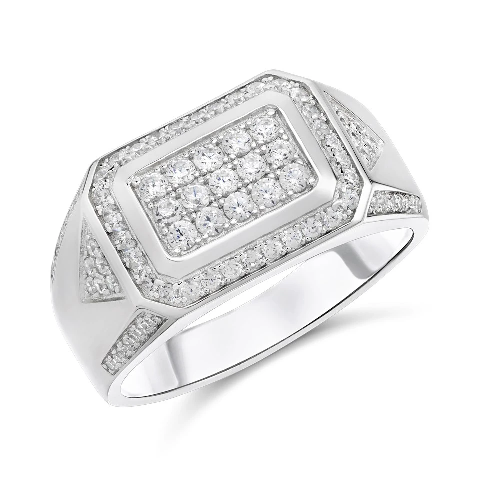 Make a statement with this sterling silver signet ring featuring a 16 x 11mm stone set rectangular head and patterned stone set shoulders. A great value for money sparkler.
