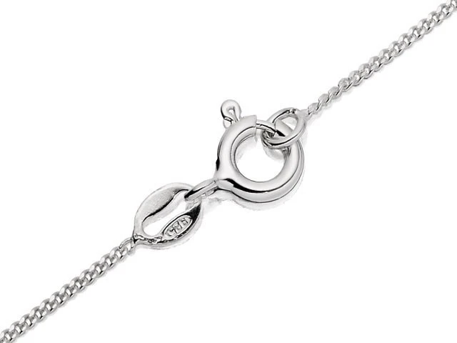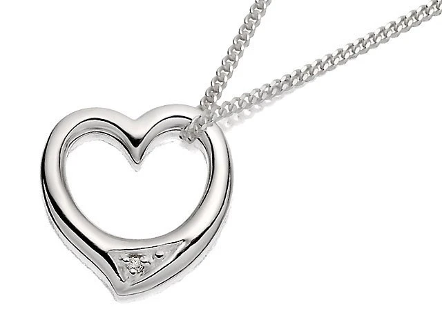 A simple floating sterling silver heart pendant 12 x 10mm with a diamond accent at the point of the heart, hanging freely on a fine 16in/41cm curb chain.
