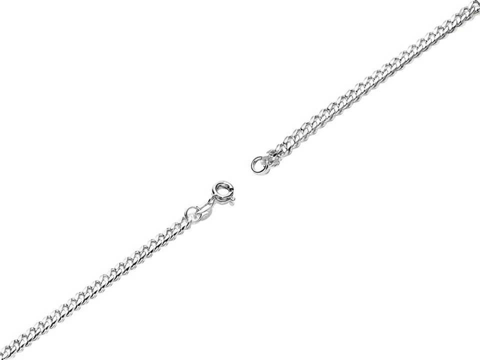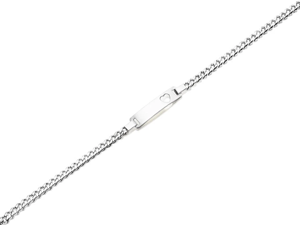 A charming 17cm/7″ long sterling silver identity bracelet with a comfortable curb chain bracelet and 5 x 24mm identity panel. Engrave a name or even a special message alongside the cut out heart to show you really care (engraving extra, must be arranged in store).