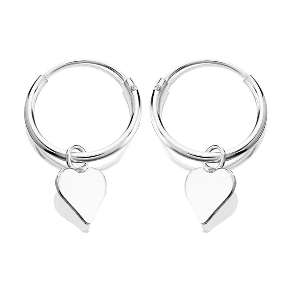 Simple 12mm wide sterling silver hoop earrings enhanced with a free moving heart charm dropper.