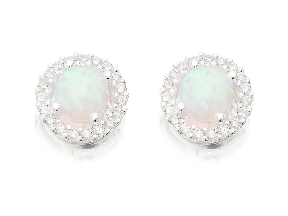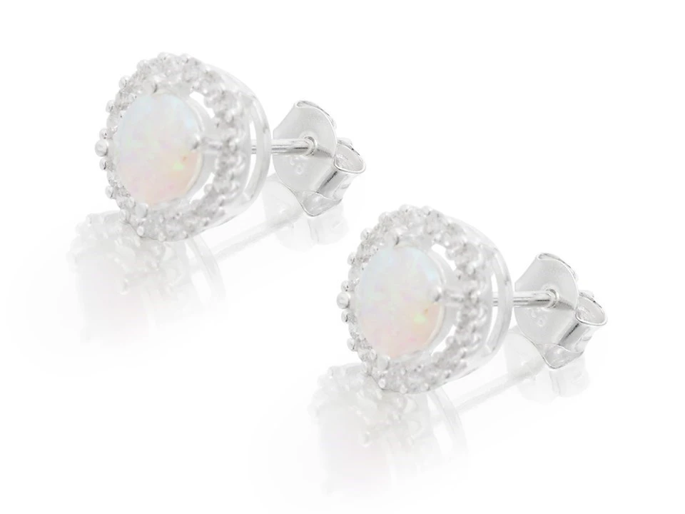 Inexpensive silver stud earrings that look so much more expensive – an impressive 6mm wide, imitation opal is encircled by lots of little cubic zirconias. Total with 9mm, finished with silver butterfly scrolls.