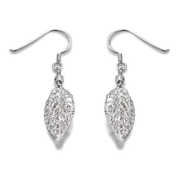 A three dimensional sterling silver leaf, with four sides and diamond cut patterning to the veins together create these unusual earrings – total drop 40mm.