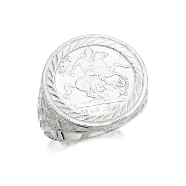 A chunky and popular style of men’s ring made from sterling silver. Boasting a 21mm wide imitation coin/medallion with a picture of St. George, the 15mm wide tapered shoulders feature an attractive cross hatch design. Made in the UK.