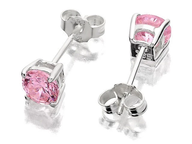 Brilliant cut 5mm, pink cubic zirconias in a four claw sterling silver setting.
