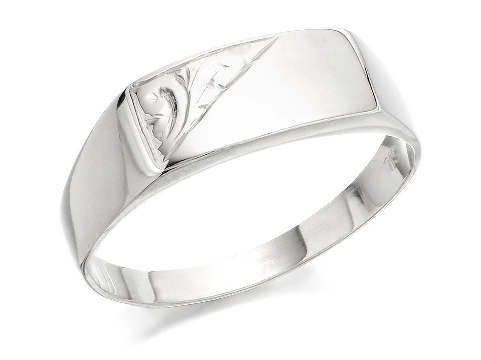 A gent’s sterling silver signet ring featuring a 14 x 7mm rectangular panel with an attractive filigree pattern across one corner. Made in the UK.