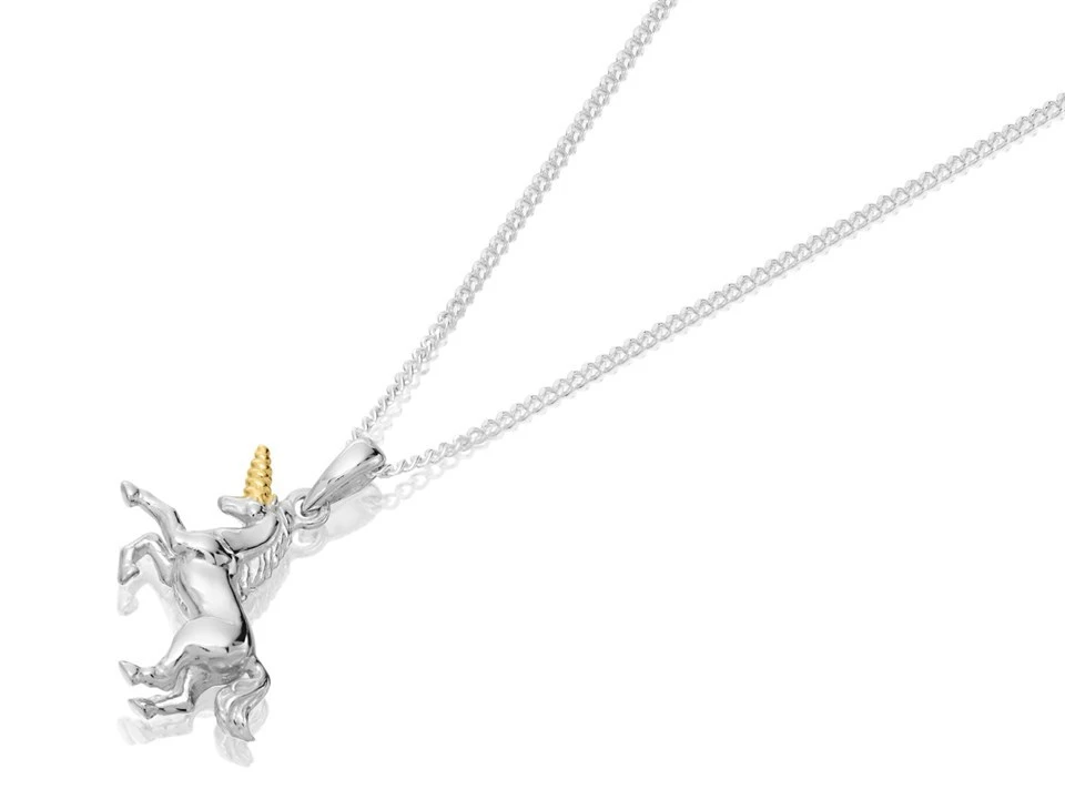 A charming, detailed, sterling silver 17mm unicorn, with a gold tone horn strung from a 16″/41cm chain – a perfect gift for any unicorn fan.