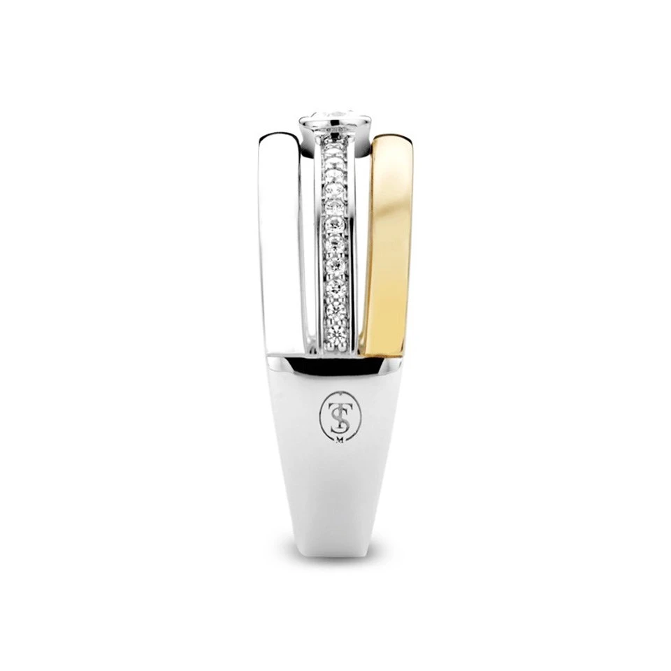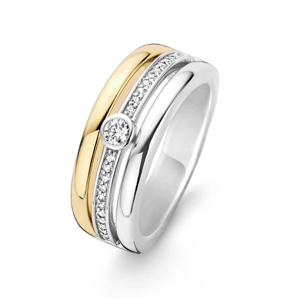 This stunning TI SENTO – Milano stacked ring is made of rhodium plated sterling silver and boasts 18ct gold plating with pretty pavé-set with zirconias. You can combine this ring with other gold plated pieces from the TI SENTO collection. 9mm wide.